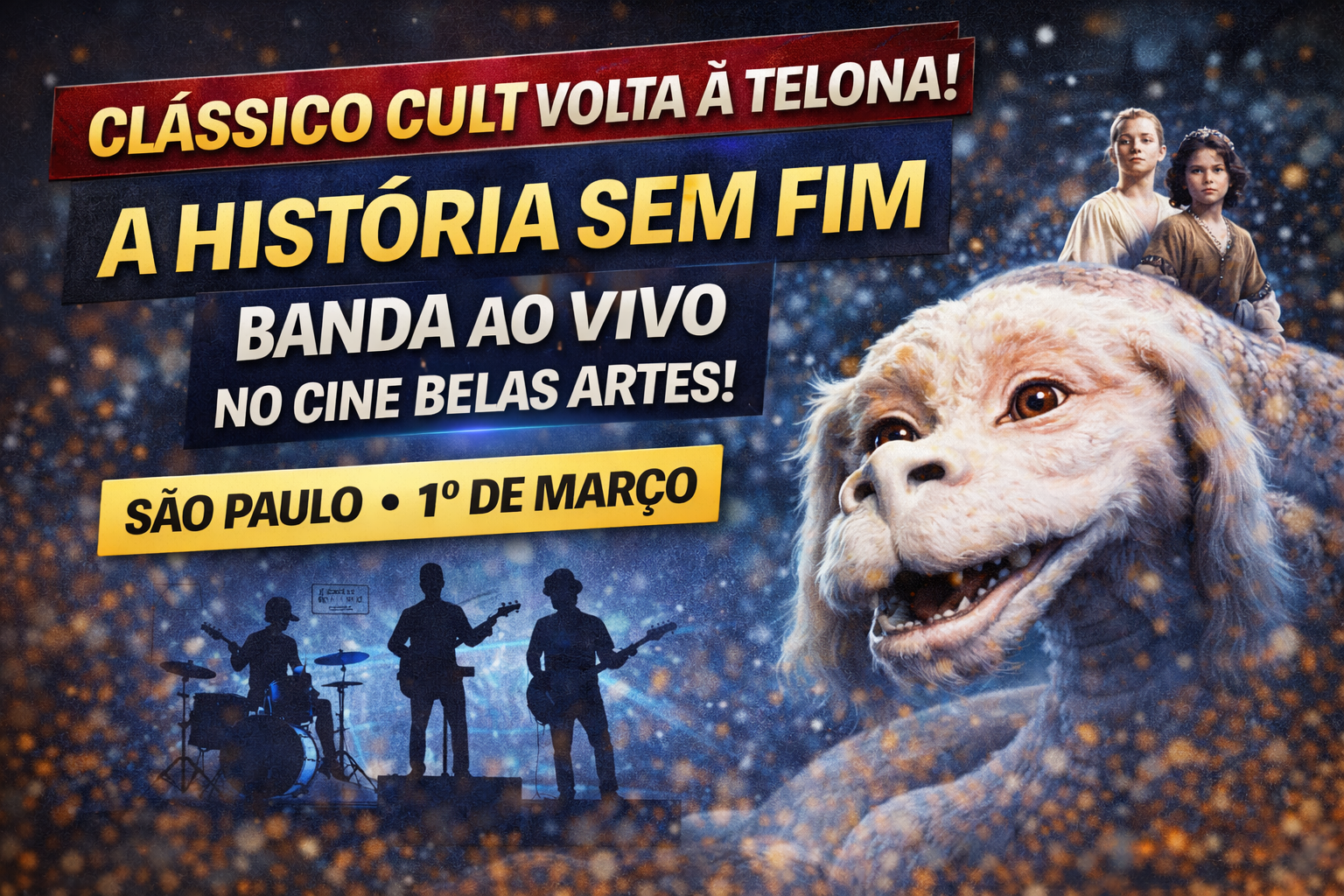 O icônico filme “A História Sem Fim”, lançado em 1984, retorna às telas em uma proposta diferente e imersiva: uma exibição com trilha sonora executada ao vivo por banda instrumental. O evento integra a programação mensal Belas Sonoriza, realizada pelo tradicional Cine Belas Artes, em São Paulo.